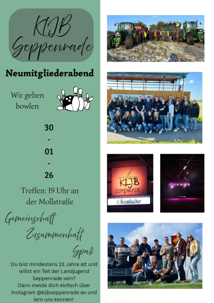 Du bist mindestens 15 Jahre alt und willst ein Teil der Landjugend Seppenrade werden? Dann komm gerne zu unserem Neumitgliederabend am Freitag, 30.01.2026! Wir treffen uns um 19 Uhr an der Mollstraße. Von da aus wollen wir gemeinsam zum Bowlen fahren! Wenn wir Dein Interesse geweckt haben, melde dich gerne über Instagram per Direktnachricht an @kljbseppenrade an. Wir freuen uns auf Dich!